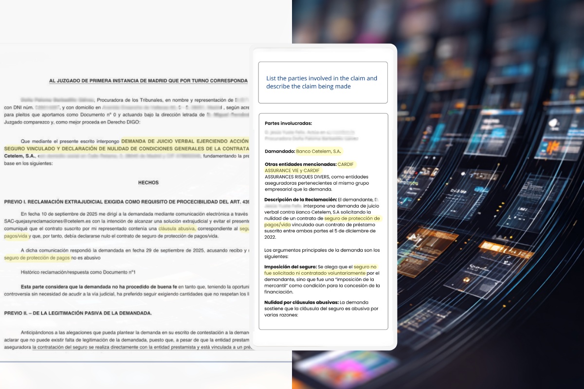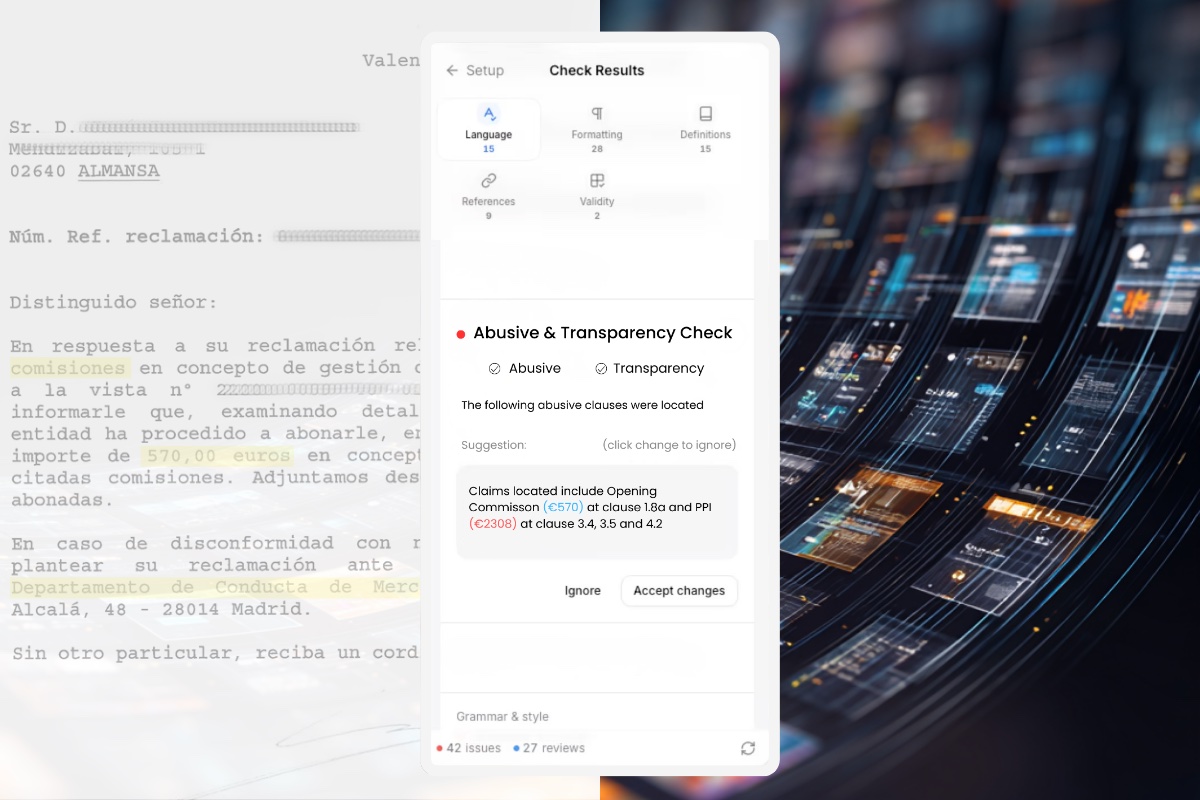 Our legal AI agent analyses legal documents, case law, and finance agreements to identify relevant information, summarise key points and detect abusive clauses and lack of transparency.